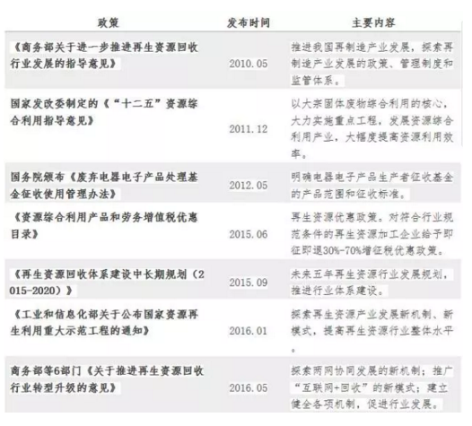2015年7月,國務(wù)院發(fā)布《國務(wù)院關(guān)于積極推進“互聯(lián)網(wǎng)+”行動的指導(dǎo)意見》,引導(dǎo)再生資源回收行業(yè)向信息化、自動化、智能化方向發(fā)展,促進再生資源交易透明化、便利化。2016年5月,商務(wù)部等國家六部委印發(fā)了《關(guān)于推進再生資源回收行業(yè)轉(zhuǎn)型升級的意見》。強調(diào)推廣“互聯(lián)網(wǎng)+回收”的新模式;建立完善各項機制,促進行業(yè)發(fā)展。