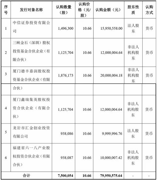 其中,中信證券認(rèn)購1595.06萬元;三峽金石(深圳)股權(quán)投資基金合伙企業(yè)(有限合伙)認(rèn)購1200萬元;廈門德豐嘉潤股權(quán)投資基金合伙企業(yè)(有限合伙)認(rèn)購2000萬元。