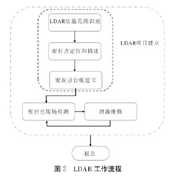 美國(guó)《石化企業(yè)泄漏檢測(cè)與修復(fù)工作指南》將LDAR工作流程劃分為L(zhǎng)DAR項(xiàng)目建立、現(xiàn)場(chǎng)檢測(cè)和泄漏維修3個(gè)步驟,對(duì)其進(jìn)行進(jìn)一步拆解,可將LDAR工作流程劃分為L(zhǎng)DAR實(shí)施范圍識(shí)別、密封點(diǎn)定位和描述、密封點(diǎn)臺(tái)賬建立、密封點(diǎn)現(xiàn)場(chǎng)檢測(cè)、泄漏點(diǎn)維修、出具報(bào)告6個(gè)步驟,如圖2所示。