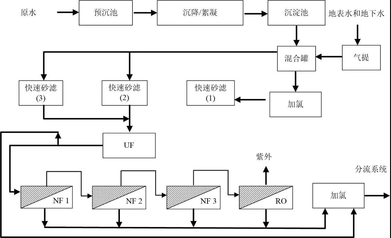 作為被重點(diǎn)關(guān)注的凈水技術(shù)之一,近年來NF被應(yīng)用于飲用水的深度處理工藝中。飲用水深度處理中,NF不僅可以去除水中殘留的微量有機(jī)物質(zhì)(如農(nóng)藥、殺蟲劑等)和消毒副產(chǎn)物(三鹵甲烷、鹵乙酸等),截留水中藻類、細(xì)菌、致突變物及病原微生物以保證生物安全性,去除重金屬等有害多價離子,保留水中部分對人體有益的礦物質(zhì),還能夠在水源水質(zhì)波動和應(yīng)急性條件下保證最終供水水質(zhì)的穩(wěn)定,滿足不同水源條件下的用水需求。對于水源水質(zhì)復(fù)雜且用水要求較高的經(jīng)濟(jì)發(fā)達(dá)地區(qū),作為一種新型的分離膜,NF具有優(yōu)異的分離性能,且操作壓力小,選用NF膜技術(shù)作為飲用水水質(zhì)的深度處理工藝可能是最為合適的選擇。