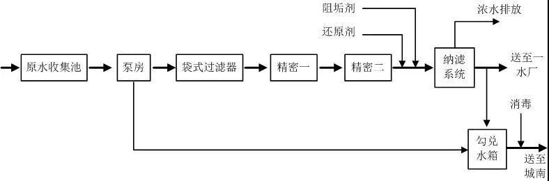 我國中西部地區(qū)水源具有的普遍問題是鹽度(硫酸鹽等)、硬度(鈣鎂含量高)、金屬離子和有機(jī)物含量超標(biāo),國內(nèi)一些市政水廠已開始使用納濾法處理高鹽原水。山西省呂梁市六壁頭水廠(運(yùn)行流程如圖6所示),針對硫酸鹽、硬度高、處理水量大的實(shí)際情況,通過方案比選,采用一級兩段式納濾膜處理工藝,處理部分原水再與原水混合的方案,該系統(tǒng)運(yùn)行情況良好,出水水質(zhì)較好。由流程圖6可以看出,原水取自原水收集池,經(jīng)原水泵升壓后,進(jìn)入三級過濾器去除大部分懸浮物和膠體,再送入NF系統(tǒng)處理。經(jīng)NF處理后的脫鹽水,部分與剩余原水按一定比例進(jìn)入勾兌水箱,消毒后加壓外輸至城南;部分脫鹽水通過原輸水管道重力自流至一水廠。