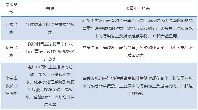 電廠廢水來源廣泛,主要分為以下幾類:沖灰廢水、脫硫廢水、工業(yè)廢水(化學(xué)廢水及含油廢水)。與化工、造紙等工業(yè)廢水相比,火電廠的廢水有以下特點:水質(zhì)水量差異很大,劃分的廢水的種類較多;廢水中的污染成分以無機(jī)物為主,有機(jī)污染物主要是油;間斷性排水較多。電廠廢水來源及水質(zhì)特點總結(jié)于下表。