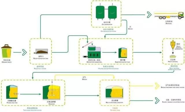 厭氧發(fā)酵技術(shù)的優(yōu)點是垃圾的減量化,資源化處理效果好,產(chǎn)生的沼氣發(fā)電可作為新能源補充現(xiàn)有常規(guī)能源。厭氧發(fā)酵過程中無臭氣逸出,發(fā)酵后不會產(chǎn)生二次污染,社會大眾的接受程度較高。由于餐廚垃圾的厭氧降解過程主要是在密閉的反應器(發(fā)酵罐)中進行的,因此反應器的運行參數(shù)會直接影響到厭氧發(fā)酵的過程。按照反應器運行的技術(shù)參數(shù),厭氧工藝可分為:中溫工藝與高溫工藝(按照反應器內(nèi)溫度劃分);單相工藝與兩相工藝(按照厭氧降解階段劃分);序批次工藝與連續(xù)式工藝(按照進料方式劃分)。