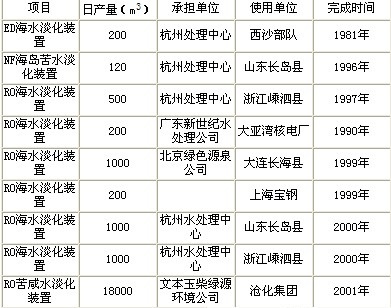 我國(guó)海水淡化技術(shù)的應(yīng)用從上世紀(jì)七十年代初推廣用小型電滲析(ED)海水淡化器開始,1981年建成了200m3/d ED淡化裝置,“九五”期間相繼建成了RO淡水裝置,多為小型或示范工程(表1), 并向馬爾代夫和基里巴斯輸出了ED和RO海水淡化裝置。