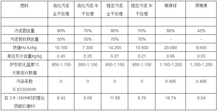 當(dāng)消化污泥的有機(jī)物含量 OTR = 50% 和干化后污泥固含量為90% DS時(shí),污泥熱值大約是Hu = 10,100 kJ/kg 或 2.81 kWh/kg。在以下表 1內(nèi),舉例列出了各種不同類(lèi)型的消化污泥和好氧穩(wěn)定化污泥性能參數(shù),并和褐煤進(jìn)行比較。根據(jù)污泥熱值,還計(jì)算了干化污泥的熱能商業(yè)價(jià)值。