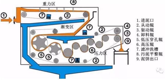 這是一個(gè)典型的濃縮壓濾一體機(jī)的構(gòu)造圖,從污泥濃縮壓濾一體機(jī)的結(jié)構(gòu)上來看,壓濾機(jī)分為三個(gè)部分,一部分是重力區(qū),在這個(gè)區(qū)間,主要是加了絮凝劑的污泥在污泥平攤輥的作用下,平攤到壓濾機(jī)上部平整的濾帶上,這部分濾帶沒有擠壓作用,僅僅是依靠加藥后的污泥和水分離開,水依靠重力作用通過濾帶流走的;第二部分進(jìn)入漸變區(qū),這個(gè)區(qū)域,開始有了第二條濾帶參與進(jìn)來,污泥開始進(jìn)入到一個(gè)上下兩條帶之間的位置,并逐漸受到上下兩條濾帶的包圍,并由寬變窄,形成一個(gè)漸變的區(qū)域,在這部分區(qū)域的污泥之間的水分在漸變的過程中得到一定的去除;第三部分進(jìn)入壓力區(qū),這部分濾帶上下開始強(qiáng)力擠壓,污泥中被絮凝藥劑剝離的顆粒之間的水分在壓力作用下從污泥中擠壓出去,通過濾帶流走。