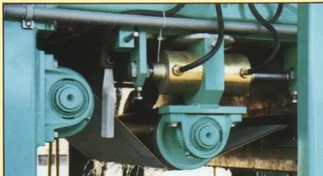 在脫水機(jī)的濾帶兩側(cè),各裝有一個(gè)限位開關(guān),和濾帶保持一定的距離,在濾帶碰觸到限位開關(guān)以后,限位開關(guān)給糾偏氣缸的空氣電動(dòng)閥一個(gè)開啟信號(hào),糾偏氣缸開始動(dòng)作,推動(dòng)糾偏輥?zhàn)?,濾帶在糾偏輥?zhàn)拥膸?dòng)下,回歸到正常的位置,完成一次完整的糾偏。帶式壓濾脫水機(jī)在運(yùn)行中,不斷的進(jìn)行糾偏動(dòng)作,對(duì)跑偏的濾帶進(jìn)行糾偏,從而保證了帶式壓濾機(jī)的正常穩(wěn)定的運(yùn)行。