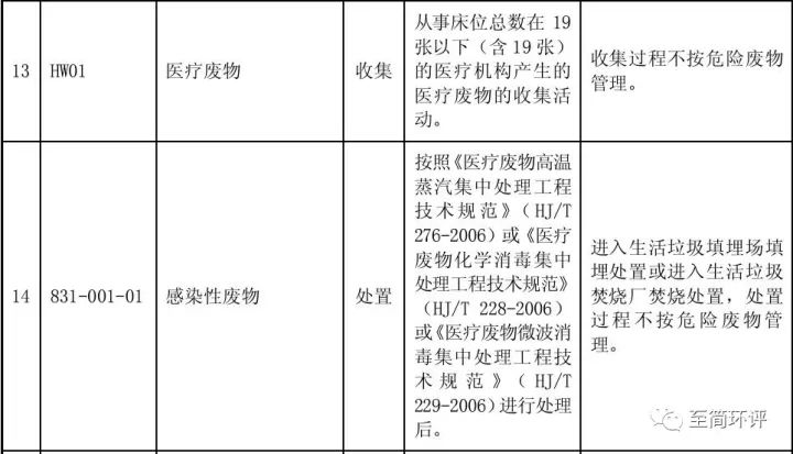 根據(jù)上文中將醫(yī)療廢水污泥歸類于醫(yī)療廢物中的“感染性廢物”(831-001-01),結(jié)合上表,豁免情況就很明朗了。即19張(含)床位數(shù)以下的醫(yī)療機構(gòu)產(chǎn)生的醫(yī)療廢物的收集活動,包括污泥,收集過程不按危險廢物管理;另外,感染性廢物,當(dāng)然包括污泥處置環(huán)節(jié)不按危險廢物處理。