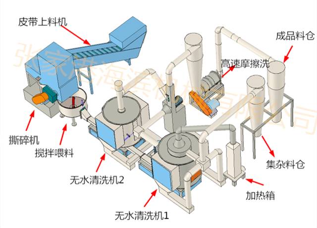 無水清洗回收設(shè)備主要由皮帶上料機(jī)、單軸撕碎機(jī)、攪拌定量喂料、無水清洗機(jī)、高速摩擦清洗機(jī)和凈料及干渣收集等設(shè)備組成。