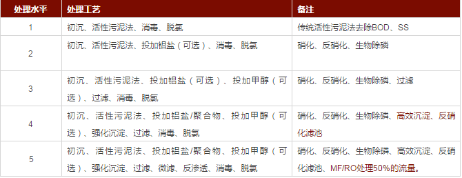 從上表中可以看到,對(duì)于TN<10mg/L以內(nèi)的要求只是常規(guī)的硝化反硝化+生物除磷+過(guò)濾,可選擇性地投加化學(xué)除磷藥劑和外加碳源,并不包含反硝化濾池。反硝化濾池只用于處理水平4(TN<3mg/L)和處理水平5(TN<2mg/L)的要求。