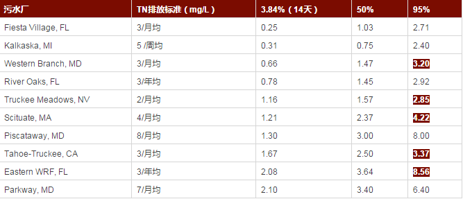 同時(shí),在上述統(tǒng)計(jì)分析過(guò)程中,TPS-14d與TPS-50%、TPS-95%的比值也是一個(gè)有趣的現(xiàn)象,對(duì)于TN和TP,TPS-14d約為TPS-50%的40~60%,TPS-95%約為TPS-50%的200~300%,這充分說(shuō)明即使在美國(guó)最好的脫氮除磷污水處理廠(相當(dāng)一部分是達(dá)到極限脫氮除磷標(biāo)準(zhǔn))其出水氮磷水質(zhì)也存在較大的波動(dòng)性。