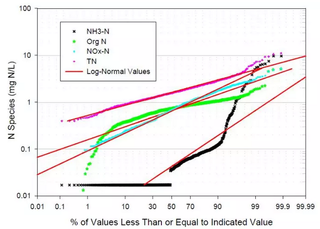 盡管WesternBranch污水處理廠出水TN的中位值為1.72mg/L,但當(dāng)覆蓋率達(dá)到99.9%時(shí)出水TN已經(jīng)接近10mg/L。由此可見(jiàn),從上述美國(guó)一些污水處理廠出水水質(zhì)統(tǒng)計(jì)學(xué)的結(jié)果反映出一個(gè)基本事實(shí):達(dá)到“高排放標(biāo)準(zhǔn)”的同時(shí)實(shí)現(xiàn)高覆蓋率是不現(xiàn)實(shí)的。
