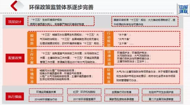 2017年以來,環(huán)保監(jiān)管體系重構(gòu):從頂層政策,如“十三五”生態(tài)環(huán)境保護(hù)規(guī)劃,到水、氣、固、土壤的配套政策,再到環(huán)保垂改、專項(xiàng)整治等具體措施,三位一體重構(gòu)環(huán)保政策監(jiān)管體系,強(qiáng)調(diào)治理效果,提升監(jiān)管力度。在責(zé)任主體、監(jiān)管體系、排污收費(fèi)、排污許可、排污權(quán)交易等五個(gè)方面進(jìn)行重大改革,從多個(gè)方面吸引社會力量共同改善環(huán)境質(zhì)量,把過去被動化、模糊化的管理變?yōu)榱酥鲃踊?、定量化、清晰化的管理?/p>