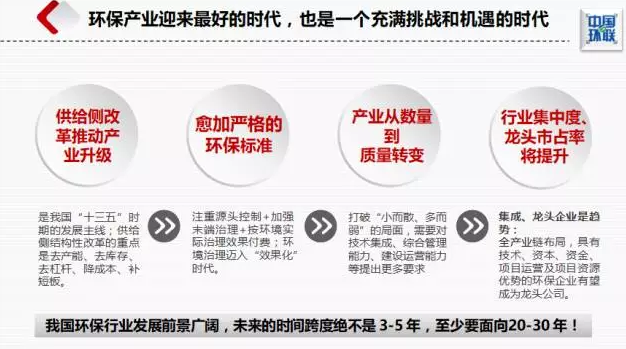 供給側(cè)改革是我國“十三五”時(shí)期的發(fā)展主線,而環(huán)保是推進(jìn)供給側(cè)改革的重要手段。十九大進(jìn)一步明確了“綠水青山就是金山銀山”的戰(zhàn)略思想,我國的環(huán)保產(chǎn)業(yè)發(fā)展正迎來最好的時(shí)代,環(huán)保標(biāo)準(zhǔn)將越來越高,環(huán)境治理邁入“效果化”時(shí)代,環(huán)保產(chǎn)業(yè)將經(jīng)歷從數(shù)量到質(zhì)量的變化。與此同時(shí),并購持續(xù),行業(yè)集中度提升,擁有較強(qiáng)技術(shù)集成能力、綜合管理能力、建設(shè)運(yùn)營能力的龍頭企業(yè)市場占有率將穩(wěn)步提升。我國環(huán)保行業(yè)發(fā)展前景廣闊,未來的時(shí)間跨度絕不是 3-5 年,至少要面向20-30 年。
