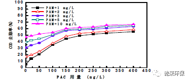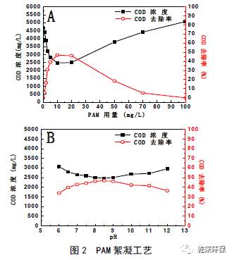 絮凝性能。所以,PAC 和PAM 用量分別宜為150mg/L 和3mg/L , 此時(shí)COD 去除率為57% , COD 濃度為2,003mg/L。