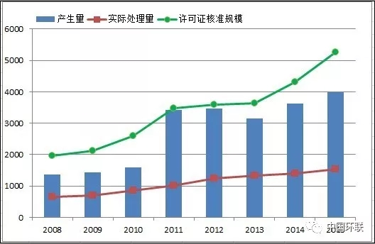 2008~2015年危廢許可證規(guī)模、產(chǎn)生量與實際經(jīng)營規(guī)模對比趨勢圖