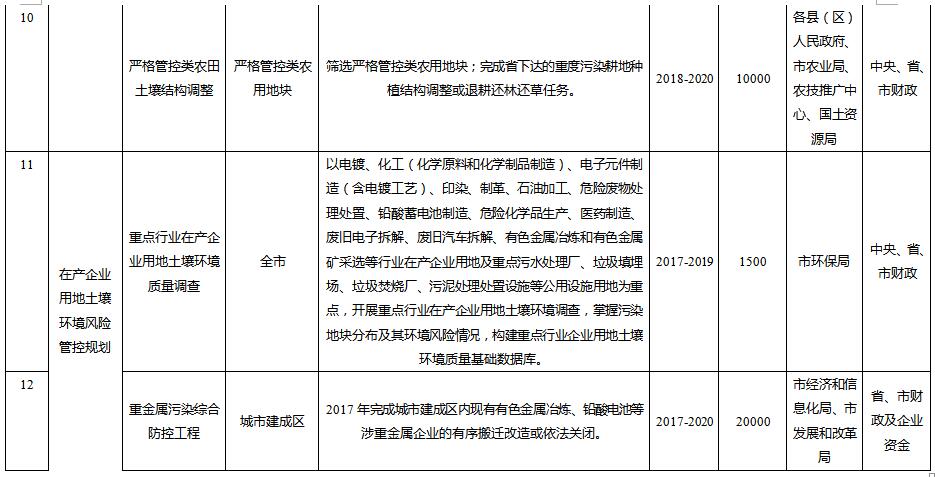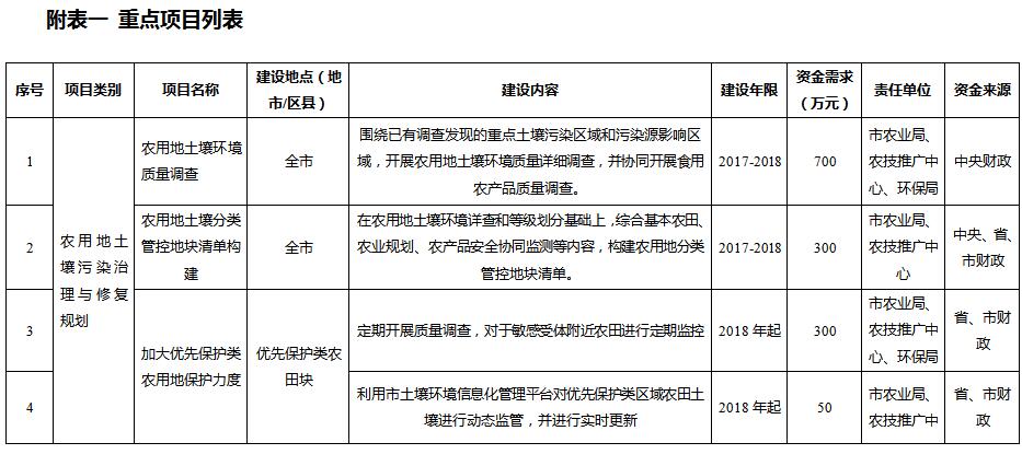 農(nóng)用地土壤分區(qū)分類管控與治理修復重點項目共10項,需專項資金總計41850萬元;在產(chǎn)企業(yè)用地土壤環(huán)境風險管控重點項目共5項,預計專項資金總計47800萬元;關(guān)閉搬遷企業(yè)地塊土壤治理與修復項目共3項,預計專項資金總計14200萬元;垃圾填埋場及周邊環(huán)境整治重點項目共5項,預計專項資金總計14709萬元;土壤修復整治重點項目共15項,預計專項資金總計54600萬元;工業(yè)園區(qū)風險防范共2項,預計專項資金總計8300萬元;土壤污染防治能力提升重點項目共3項,預計專項資金總計6700萬元。