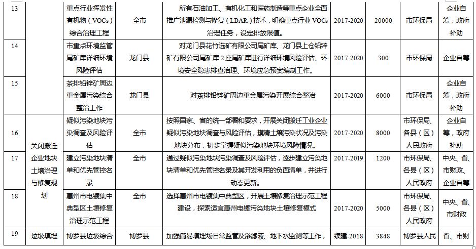 緊密圍繞惠州市土壤治理和修復工作建設(shè)目標,計劃開展重點項目共計6大類28項。重點項目資金主要來源于中央資金、地方財政資金及企業(yè)自籌。