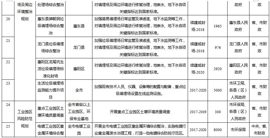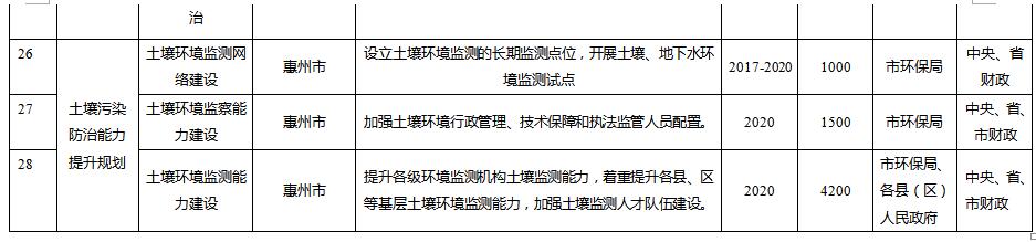 規(guī)劃從惠州市農(nóng)用地土壤分區(qū)分類管控與治理修復、在產(chǎn)企業(yè)用地土壤環(huán)境風險管控、關(guān)閉搬遷企業(yè)地塊土壤治理與修復、垃圾填埋場及周邊環(huán)境整治、工業(yè)園區(qū)風險防范、未利用地保護、土壤污染防治能力提升等方面建設(shè)6大類重點項目。其中:
