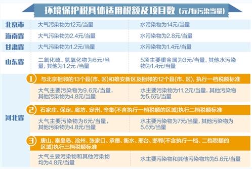 日前,北京市應(yīng)稅大氣污染物和水污染物適用稅額標準獲市人大常委會審議通過,分別為每污染當量12元和14元,按法定幅度“頂格”執(zhí)行。從目前各地發(fā)布的方案來看,環(huán)保稅稅額標準相對較高的有北京、上海、天津、河北、山東等地。以應(yīng)稅大氣污染物適用稅額標準為例,河北按照國家規(guī)定最低標準的8倍、5倍、4倍執(zhí)行;上海二氧化硫、氮氧化物的稅額標準分別為每污染當量6.65元和7.6元;山東二氧化硫、氮氧化物每污染當量6元。
