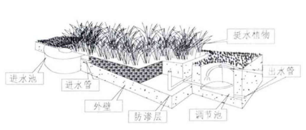 同時也為池體設(shè)計了防滲層,以確保其結(jié)構(gòu)更加緊湊,易于建造。為了更好實現(xiàn)物質(zhì)降解,該人工濕地系統(tǒng)所采用的水生植物迎合了當(dāng)?shù)剌^為潮濕的氣候環(huán)境,例如香蒲、菖蒲、蘆葦、水蔥等,如圖1所示。