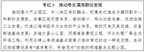 建設(shè)廣東省新型城鎮(zhèn)化綜合試驗(yàn)區(qū)、產(chǎn)城融合示范區(qū)、區(qū)域協(xié)調(diào)發(fā)展先行區(qū);打造世界級(jí)新能源新材料聚集地、全國重要石化能源基地、粵東專業(yè)物流中心、粵東醫(yī)教高地、重要濱海旅游目的地;沿海綠色防護(hù)帶重要組成部分。