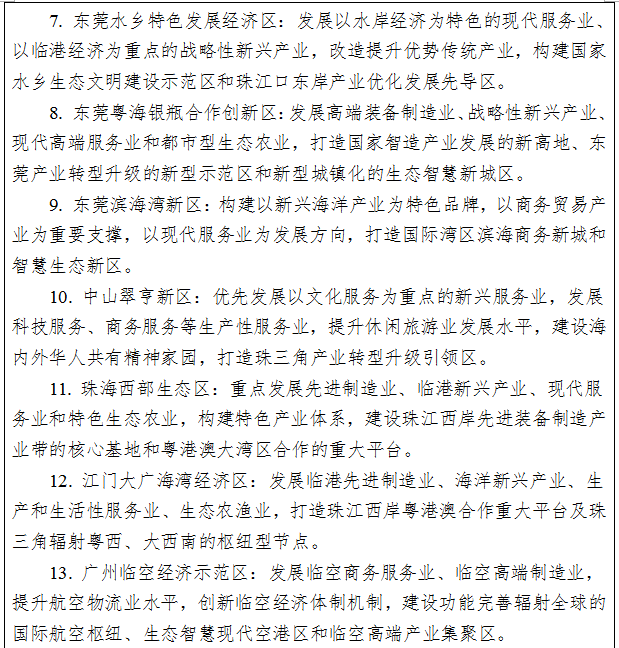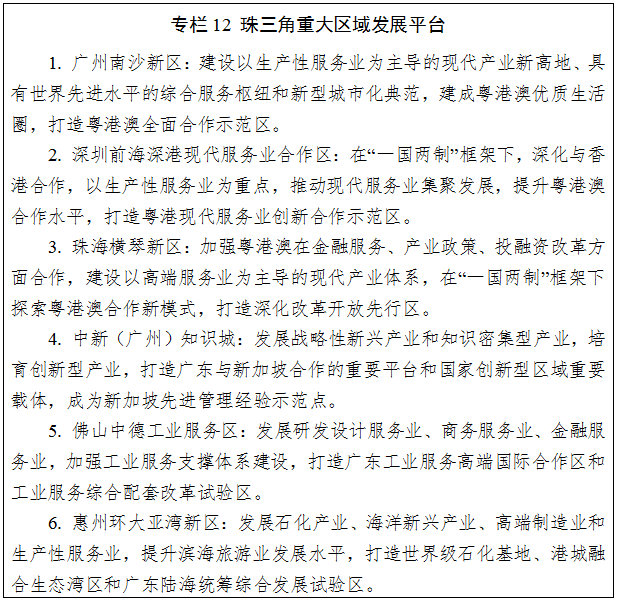 產(chǎn)業(yè)發(fā)展。積極落實(shí)粵港澳大灣區(qū)發(fā)展戰(zhàn)略,發(fā)揮深圳、廣州龍頭帶動(dòng)作用,大力推進(jìn)廣深科技創(chuàng)新走廊建設(shè),形成高度發(fā)達(dá)的創(chuàng)新經(jīng)濟(jì)帶,輻射帶動(dòng)全省創(chuàng)新發(fā)展。打造全球產(chǎn)業(yè)創(chuàng)新高地,建設(shè)具有國際影響力的戰(zhàn)略性新興產(chǎn)業(yè)高地、信息經(jīng)濟(jì)高地、智能制造高地,重點(diǎn)布局在深圳、廣州、珠海等地。建設(shè)世界級(jí)先進(jìn)的電子信息、裝備制造、石化等產(chǎn)業(yè)基地,重點(diǎn)布局在佛山、惠州、東莞、中山、江門等。重點(diǎn)打造全球金融中心、全球貿(mào)易中心、全球物流中心、國際化的消費(fèi)中心、世界休閑旅游中心,主要布局在廣州、深圳。大力發(fā)展廣深珠高端制造業(yè),支持珠海培育智能制造和戰(zhàn)略性新興產(chǎn)業(yè),帶動(dòng)珠江西岸產(chǎn)業(yè)發(fā)展。大力建設(shè)佛山和東莞科技成果轉(zhuǎn)化基地。建設(shè)惠州、中山、江門等區(qū)域生產(chǎn)制造基地。加快構(gòu)筑區(qū)域發(fā)展重大平臺(tái)。建設(shè)南海油氣資源勘探開發(fā)保障基地,加快推進(jìn)天然氣水合物產(chǎn)業(yè)發(fā)展;推動(dòng)江門循環(huán)經(jīng)濟(jì)和環(huán)保產(chǎn)業(yè)示范區(qū)建設(shè);在港口、桂山、金灣等海域發(fā)展海上風(fēng)電。