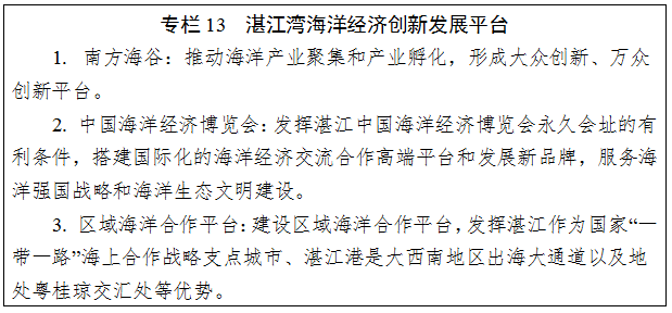 產(chǎn)業(yè)發(fā)展。加快推進(jìn)海洋經(jīng)濟(jì)創(chuàng)新發(fā)展示范城市及海洋經(jīng)濟(jì)示范區(qū)建設(shè)。推動(dòng)鋼鐵、石化產(chǎn)業(yè)及其園區(qū)發(fā)展,建設(shè)東海島高端臨?,F(xiàn)代制造業(yè)集群;推動(dòng)海洋工程裝備制造和海洋生物醫(yī)藥等海洋產(chǎn)業(yè)示范基地發(fā)展以及物流園區(qū)和產(chǎn)學(xué)研合作園區(qū)建設(shè);發(fā)揮漁業(yè)資源優(yōu)勢(shì),發(fā)展深加工漁業(yè),推動(dòng)遠(yuǎn)洋漁業(yè)基地建設(shè);對(duì)接北部灣地區(qū)和海南國際旅游島,共同打造粵桂瓊濱海旅游“金三角”,將其建設(shè)成為具有國際影響的休閑度假旅游目的地。在新寮群島、外羅水道、徐聞等海域布局海上風(fēng)電,推動(dòng)海上風(fēng)電等新能源產(chǎn)業(yè)發(fā)展。