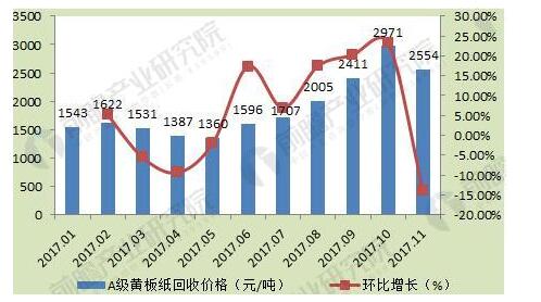 圖表1:2017年1-11月中旬(即每月15日)中國廢紙回收價(jià)格走勢(shì)(單位:元/噸)