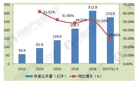 圖表3:2012-2017年前三季度中國快遞業(yè)務(wù)量走勢(shì)(單位:件,%)