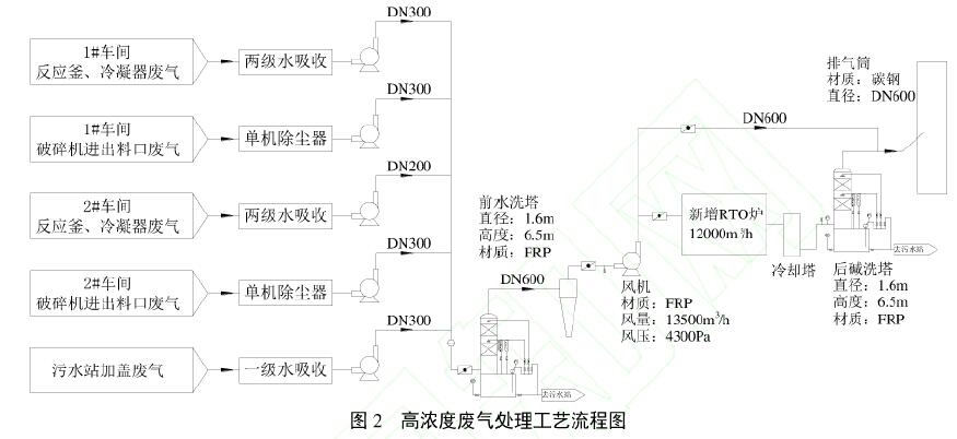 在配料釜排氣口增加脈沖布袋除塵器收集投料粉塵,反吹的粉塵直接回用至配料釜,除塵器出口廢氣中含有大量異丙醇,先接入兩級(jí)水吸收進(jìn)行預(yù)處理,再接入高濃度廢氣焚燒系統(tǒng),經(jīng)“一級(jí)水吸收+蓄熱式焚燒爐(RTO)+一級(jí)堿吸收”處理后排放。