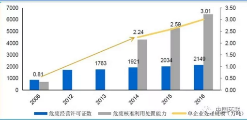 根據(jù)《固體廢物污染環(huán)境防治法執(zhí)法檢查報告》顯示,2016年全國持危險廢物經(jīng)營許可證的單位設(shè)計處置能力為6471萬噸,實際經(jīng)營規(guī)模只有1629萬噸,實際處理比例僅為25%。