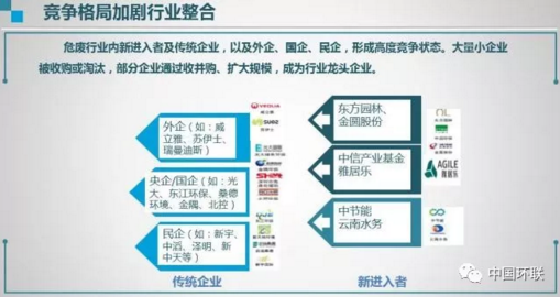 危廢市場格局是危廢行業(yè)內(nèi)新進入者及傳統(tǒng)企業(yè),及外企、國企、民企,形成高度競爭狀態(tài)。在環(huán)保調(diào)控力度加強的情況下,很多資本躍躍欲試,進入危廢處置行業(yè),包括一些大型集團,房地產(chǎn)企業(yè),綠化企業(yè),或者投資機構(gòu)等。企業(yè)跑馬圈地和異地收購將會持續(xù)下去,搶占危廢市場或?qū)⒂萦遥罅啃∑髽I(yè)被收購或淘汰,部分企業(yè)通過收并購、擴大規(guī)模,成為行業(yè)龍頭企業(yè)。
