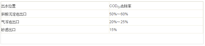 反應(yīng)槽采用推流式反應(yīng)槽,分為三格。第一格加堿將pH調(diào)高至10~10.5,加入CaCl2,第二格加FeSO4,第三格加混凝劑PAM,反應(yīng)后進入斜板沉淀池進行固液分離。三格停留時間分別為15min、15min、7.5min。斜板沉淀池表面負(fù)荷按2m3/m2˙h設(shè)計。一級反應(yīng)CODCr去除率為50%~60%。