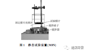 膜片處理:將大片(張)膜用除鹽水潤濕透水側,輕輕地平整固定在玻璃板上,使用特制的裁剪裝置(一端軟固定、一端鋒利刀片)將膜裁剪成需要的尺寸,切忌刮傷膜片或重壓膜片。將裁剪好的膜片在滅菌的除鹽水中浸泡24h,其間換水3次。靜態(tài)試驗的膜片需要事先固定在支撐的圓環(huán)上,再進行滅菌處理。試驗菌液(中水中微生物菌種)培養(yǎng)和配制:取中水放于事先經(jīng)過滅菌處理的潔凈燒杯中;取2個已經(jīng)殺菌的培養(yǎng)皿,利用移液管從燒杯中分別取1mL中水置于培養(yǎng)皿中。用潔凈燒杯稱取牛肉膏0.5g,蛋白胨1g,氯化鈉0.5g,瓊脂2g,加除鹽水溶于100mL錐形瓶中,攪拌并調節(jié)pH 至7.2~7.4,塞緊瓶口,放于滅菌鍋中滅菌,4h后,取出錐形瓶冷卻至50℃左右,倒入培養(yǎng)皿,以剛好覆蓋培養(yǎng)皿底部為宜;蓋好培養(yǎng)皿,置于37℃恒溫箱中培養(yǎng)24h;24h后,取出培養(yǎng)皿,用玻璃棒挑出菌落置于裝有除鹽水的燒杯中,攪拌待用。
