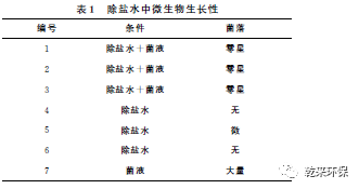 2.1反滲透產(chǎn)品水(即除鹽水)中微生物生長性研究:取6個500mL的事先滅菌處理的潔凈燒杯,分別加入200mL的除鹽水;在1、2、3號燒杯中分別加入1mL配置的菌液;將6個燒杯上口蓋緊,置于室溫下靜置,5h后分別取1mL水樣培養(yǎng),觀察培養(yǎng)皿表面菌落生長情況;同時另取一個培養(yǎng)皿(7號),取1mL原菌液模擬中水條件,進行對比培養(yǎng)。試驗結果見表1。