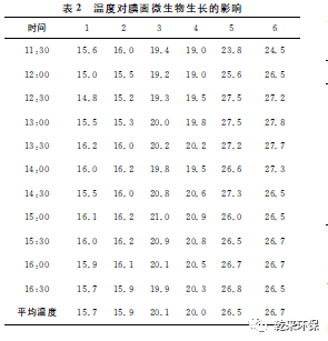 2.2水溫對微生物生長的影響:分別取6個事先滅菌處理的潔凈500mL燒杯,分別加入200mL除鹽水和1mL培養(yǎng)菌液;在1、3、5號燒杯中分別放入2片干凈的反滲透膜片,在2、4、6號燒杯中分別放入2片污染的膜片;蓋好杯口;將1、2號燒杯放入冷水浴中,維持溫度在15 ℃左右,3、4號燒杯置于室溫下,5、6號燒杯熱水浴,維持溫度30℃左右;隔0.5h測各個燒杯的水溫;5h后,取出膜片,分別置于6個事先滅菌處理的干凈燒杯中,用清洗劑清洗膜;分別從每個燒杯中取出1mL清洗液,用培養(yǎng)皿培養(yǎng),觀察菌落數(shù)的多少,1~6號燒杯中取出的清洗液中,培養(yǎng)菌落數(shù)分別為1、3、3、5、7、12個。試驗溫度見表2。