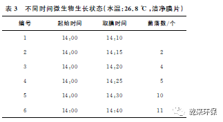 試驗結果分析:從表中可以看出,膜表面在膜浸入水樣中15min后就開始出現(xiàn)微生物附著的現(xiàn)象,而之前基本上沒有微生物污染出現(xiàn)。30min后,膜污染現(xiàn)象加重,膜表面微生物量增多。說明隨著時間的延長,膜表面微生物繁殖越來越多,膜表面污染也就越來越嚴重,嚴重時可以堵塞膜孔,阻礙過水,使得系統(tǒng)產(chǎn)水量下降。