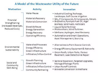 來(lái)自于污水管理機(jī)構(gòu)這些年來(lái)職務(wù)角色的自然轉(zhuǎn)變。經(jīng)過(guò)近百年的經(jīng)驗(yàn)累積,除了實(shí)現(xiàn)傳統(tǒng)目標(biāo)之外(去除污染物等),污水管理機(jī)構(gòu)還意識(shí)到,對(duì)于營(yíng)養(yǎng)物、汞和新興污染物而言,最有效的和最經(jīng)濟(jì)的解決方案是直接掌控其處置權(quán),而不是讓更多編外人員插手其中。來(lái)自于財(cái)政的壓力。在美國(guó)的許多缺水地域,特別是西部干旱地區(qū),正逐漸逼近城市水源極限,與此同時(shí),能源成本穩(wěn)步上升,地方政府的預(yù)算也因?yàn)橘Y產(chǎn)置換成本和實(shí)際處理成本的上升而被逐年拉低。在某些情況下,客戶(hù)購(gòu)買(mǎi)廢水服務(wù)的能力也有限。因此,“未來(lái)污水廠”的關(guān)鍵驅(qū)動(dòng)因素之一就來(lái)自財(cái)政壓力。對(duì)自愿采取轉(zhuǎn)型的污水管理機(jī)構(gòu)而言,從單純的廢水處理轉(zhuǎn)向可持續(xù)的資源管理,都將以降低成本和增加收入的形式帶來(lái)凈收益。轉(zhuǎn)型確實(shí)可以給環(huán)境、社會(huì)、經(jīng)濟(jì)帶來(lái)好處。環(huán)境方面,減少二氧化碳的排放量,回收資源和能源。節(jié)約產(chǎn)生的效益又將以減緩費(fèi)率增加和投資的方式反作用于社區(qū),進(jìn)一步強(qiáng)化服務(wù)和改善環(huán)境質(zhì)量。經(jīng)濟(jì)方面,企業(yè)將獲得更多的資金來(lái)投資工廠和設(shè)備以及開(kāi)展研發(fā)。這部分投資的結(jié)果將為技術(shù)和制造業(yè)創(chuàng)造新的就業(yè)機(jī)會(huì),從而帶動(dòng)一系列實(shí)體經(jīng)濟(jì)需求,政府也有可能獲得增長(zhǎng)的稅收。在當(dāng)?shù)?,污水管理機(jī)構(gòu)可以從這些價(jià)值動(dòng)力中分得紅利,并以需求增加和收入增加的形式回饋給公用事業(yè)。在全國(guó)范圍內(nèi),能源自給將會(huì)減少進(jìn)口需求,并拉動(dòng)更健康的貿(mào)易平衡。