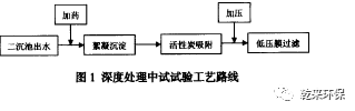 1.3工藝路線:中試試驗裝置的處理能力為1.5m3/h,安放在現場二沉池出水附近。工藝路線為,A2/O生化系統(tǒng)處理后的二沉池出水經過加藥后進入絮凝沉淀反應器,上清液進入活性炭吸附罐,出水經過加壓后進入4級串聯的低壓膜過濾罐,最終得到深度處理后的廢水,如圖1所示。
