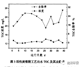 2.2活性炭吸附工藝:活性炭吸附工藝憑借自身的投資節(jié)省、操作簡單和效果顯著等優(yōu)勢,在工業(yè)化廢水處理中具有廣泛的應用,特別是對有機物具有非選擇性的吸附作用。由于存在物料流失和吸附飽和等不足之處,試驗裝置配備了自動反洗和蒸汽再生系統(tǒng)?;趯嶒炇倚≡嚨难芯拷Y果,中試試驗采用的是廣東鴻生10#顆粒木質炭,吸附停留時間為1.5h,處理結果如圖3所示。