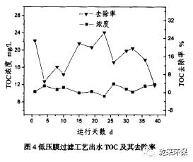 2.3低壓膜過濾工藝:活性碳纖維是碳纖維技術和活性炭技術相結合發(fā)展起來的新技術,具有過濾和吸附的雙重作用,國內外關于采用此工藝深度處理含有機物的廢水的報道逐漸增加。本文的低壓膜元件由高活性碳纖維制成,裝填在圓柱形過濾罐中,采用四級串聯運行方式,每一級可以單獨的進行反沖洗。主要工藝參數為,工作壓力為0.15—0.3MPa,孔隙率為85%,過水流量為3.5—4.5m3/(h˙m2)。低壓膜過濾工藝出水TOC及其去除率如圖4所示,