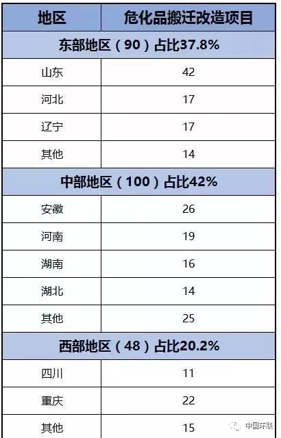 據(jù)了解,2015年,天津8·12爆炸事故發(fā)生后,工信部、國(guó)家發(fā)改委等遴選出238個(gè)危化品搬遷改造項(xiàng)目。按區(qū)域劃分,東部地區(qū)有90個(gè),占項(xiàng)目總數(shù)的37.8%,中部地區(qū)有100個(gè),占項(xiàng)目總數(shù)的42%;西部地區(qū)有48個(gè),占項(xiàng)目總數(shù)的20.2%。