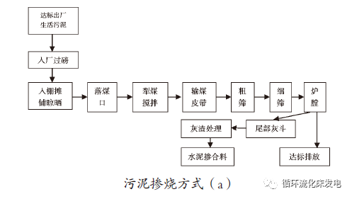 方式(a):生活污泥經(jīng)污水處理廠脫水后運(yùn)送至公司現(xiàn)場(chǎng)進(jìn)行攤鋪晾曬,然后經(jīng)輸煤系統(tǒng)與原煤混合入爐充分燃燒,從而達(dá)到資源化處理的效果,有效利用垃圾、污泥中的剩余熱值,減少原生垃圾及污泥因填埋對(duì)環(huán)境造成的持續(xù)污染問題。其污泥摻燒方式如圖1(a)所示。