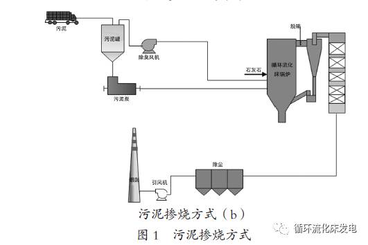方式(b):生活污泥經(jīng)污水處理廠脫水后運(yùn)送至公司污泥罐,污泥罐下部布置污泥泵(柱塞泵)。污泥直接通過污泥泵輸送至爐膛進(jìn)行燃燒處理。污泥給入口布置播料風(fēng),同時(shí)布置插板閥以防止污泥系統(tǒng)停運(yùn)時(shí)煙氣反竄。污泥罐上部布置除臭風(fēng)機(jī),將罐內(nèi)揮發(fā)氣體送至爐膛進(jìn)行燃燒凈化。其污泥摻燒方式如圖1(b)所示。