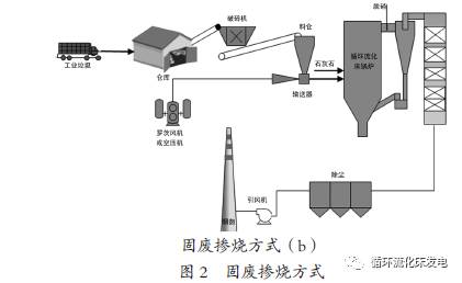 方式(b):使用氣力輸送系統(tǒng)將破碎后的固廢輸送至爐膛進(jìn)行燃燒利用。其固廢摻燒方式如圖2(b)所示。