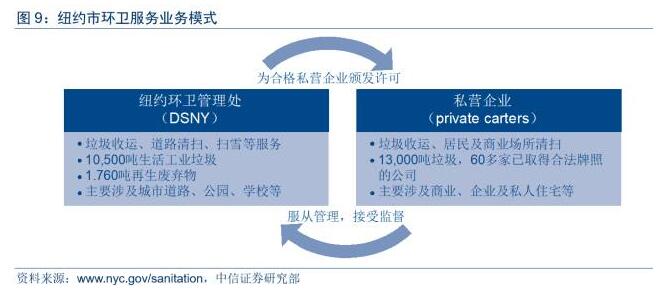 以紐約市為例,其環(huán)衛(wèi)服務(wù)業(yè)由政府環(huán)衛(wèi)管理處與私營垃圾運輸公司共同運營,但私營公司受到環(huán)衛(wèi)管理處監(jiān)管,并要遵守相關(guān)地方規(guī)范。紐約市環(huán)衛(wèi)管理處(DSNY)主要職責(zé)是垃圾收運、道路清潔和清雪,它是世界上最大的環(huán)衛(wèi)管理處,負責(zé)每天收運紐約市的10,500噸生活垃圾和工業(yè)垃圾以及1,760噸再生廢棄物。紐約市另外13,000噸垃圾由私營垃圾運輸公司(PrivateCartingCompanies)進行收運,環(huán)衛(wèi)管理處對這些私人運營負責(zé)行使監(jiān)督管理職責(zé),并發(fā)布其需要遵守的法律法規(guī)。