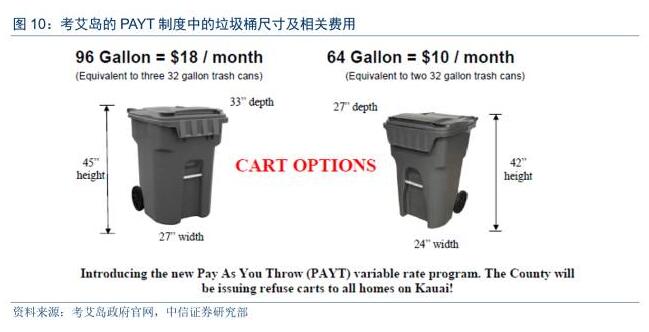 PAYT制度通常下的定價模式有全單位定價模式、部分單位定價及浮動定價等三種模式。以全單位定價的PAYT模式為例,居民首先需要購買由當(dāng)?shù)卣y(tǒng)一印刷的標(biāo)牌,并將標(biāo)牌粘貼到一定容量的垃圾袋上;或者根據(jù)自己產(chǎn)生垃圾量大小向政府申請垃圾桶,政府根據(jù)垃圾桶大小而收費。以夏威夷州的考艾島為例,該地區(qū)在2015年7月開始實行PAYT制度,居民可以選擇兩種尺寸的垃圾桶,一種是96加侖的垃圾桶,每月需付費18美元,一種是64加侖的垃圾桶,每月需付費10美元,一個64加侖的車,每月10美元。