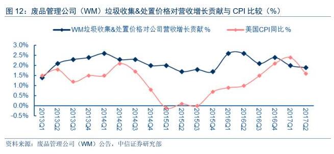 以廢品管理公司(WM)為例,2013年迄今,其廢物收集&處置季度均價均維持上漲態(tài)勢,價格同比漲幅維持在1.4%~2.6%的區(qū)間之內(nèi)(季度均值為2.1%);此外,除2017Q1外,廢品管理公司(WM)季度均價漲幅均超過同期CPI漲幅。由此可見,在和上游工商業(yè)客戶及地方政府的博弈中,美國市政廢物管理公司確實擁較強的定價能力,能夠維持長期可持續(xù)的溫和價格上漲。而行業(yè)內(nèi)企業(yè)擁有較強定價能力,是維持行業(yè)健康繁榮、企業(yè)盈利能力持續(xù)攀升的重要一環(huán)。