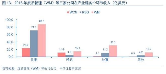 美國環(huán)衛(wèi)市場為典型的一體化模式,相關(guān)企業(yè)在大力參與前端收集&轉(zhuǎn)運業(yè)務(wù)同時,后端處置及資源回收領(lǐng)域也積極布局和參與,以充分發(fā)揮協(xié)同和提升公司競爭優(yōu)勢。從廢品管理(WM)等三家全國性市政廢物管理公司的2016年收入構(gòu)成看,收集&轉(zhuǎn)運業(yè)務(wù)收入分別占到三家公司2016年內(nèi)部抵消前總營業(yè)收入的63%、75%和94%,后端處置分別站到合并抵消前營業(yè)收入的19%、19%和4%。
